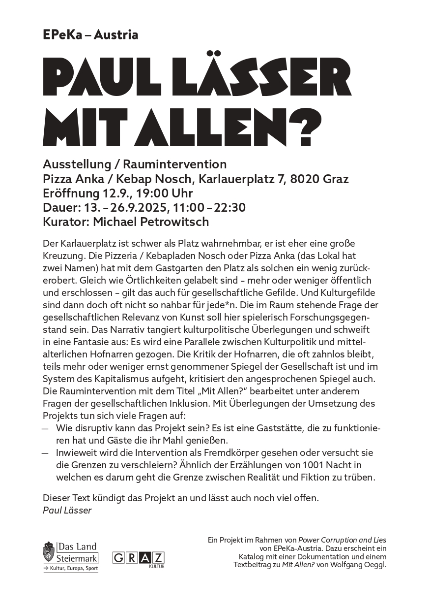 Mit: Kollektiv Brossmann Stachl, Don't let Belgrade d(r)own: Luka Knеžević Strika, Jelena Mijic und Iva Čukić, ILA, Ursula Kiesling, Kommando Anonymous Schwarzes Sonntag Reininghaus, Norbert Prettenthaler, Erwin Stefanie Posarnig